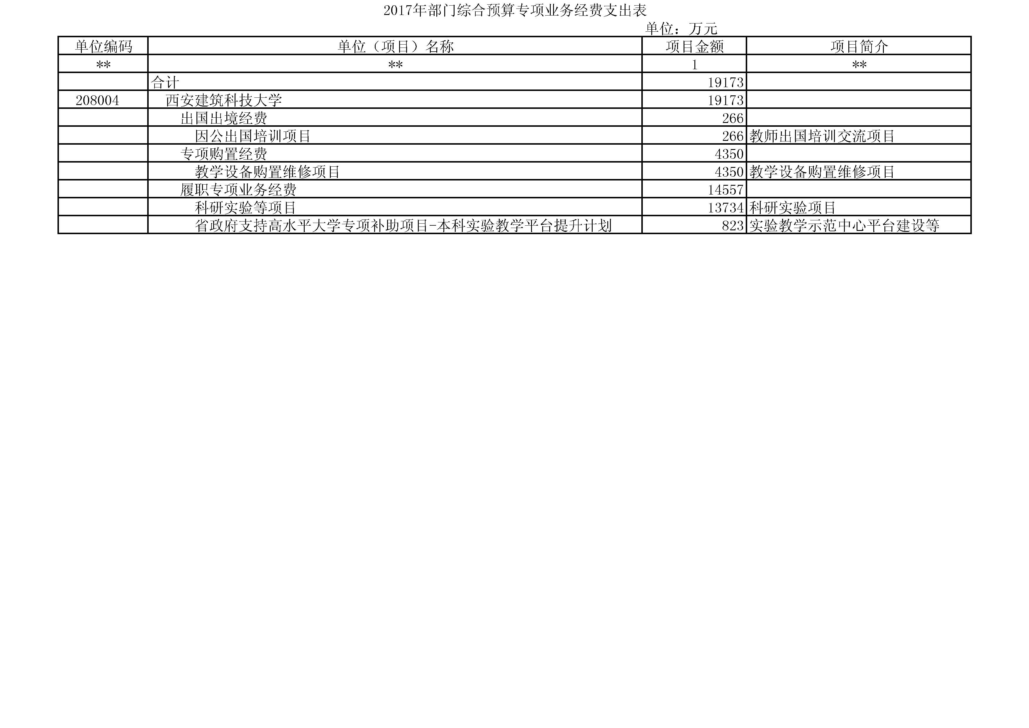 项目支出:2017年西安建筑科技大学年初项目支出预算19173万元。 其中:科研实验项目支出13734万元,高水平大学建设专项823万元,出国处境经费266万元,教学设备购置支出4350万元。