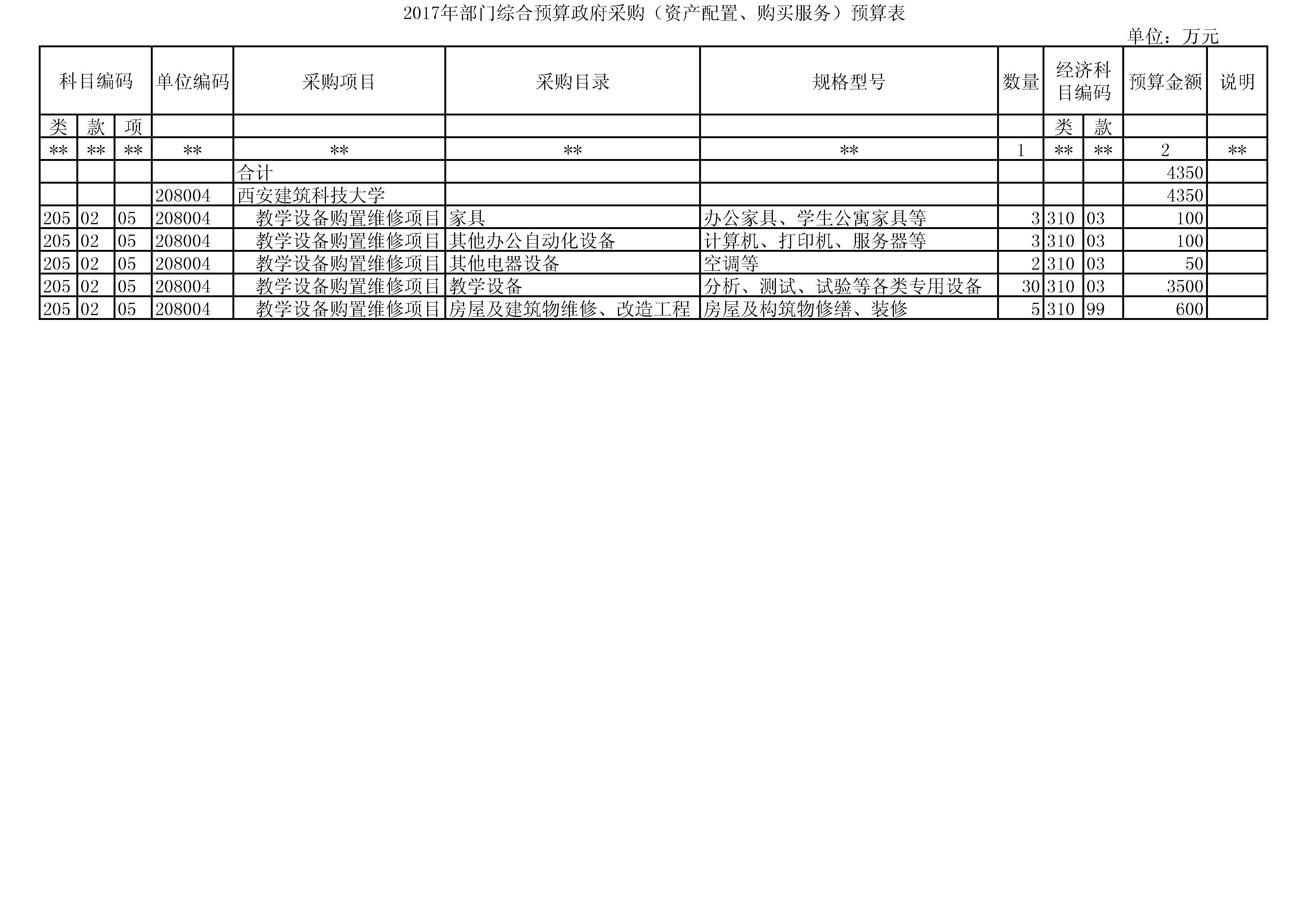 2017年度安排政府采购总计4350万元,其中家具类100万元,其他办公自动化设备类100万元,其他电器设备类50万元,教学设备类3500万元,房屋及建筑物维修、改造工程类600万元。